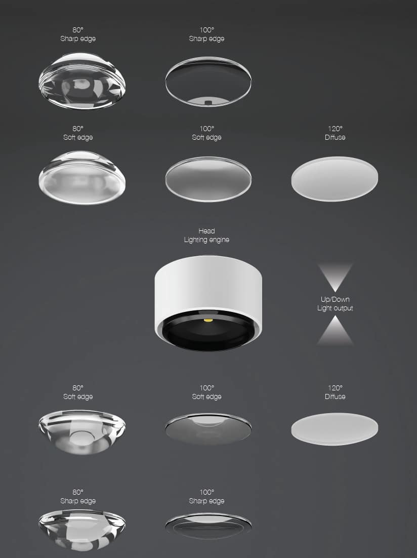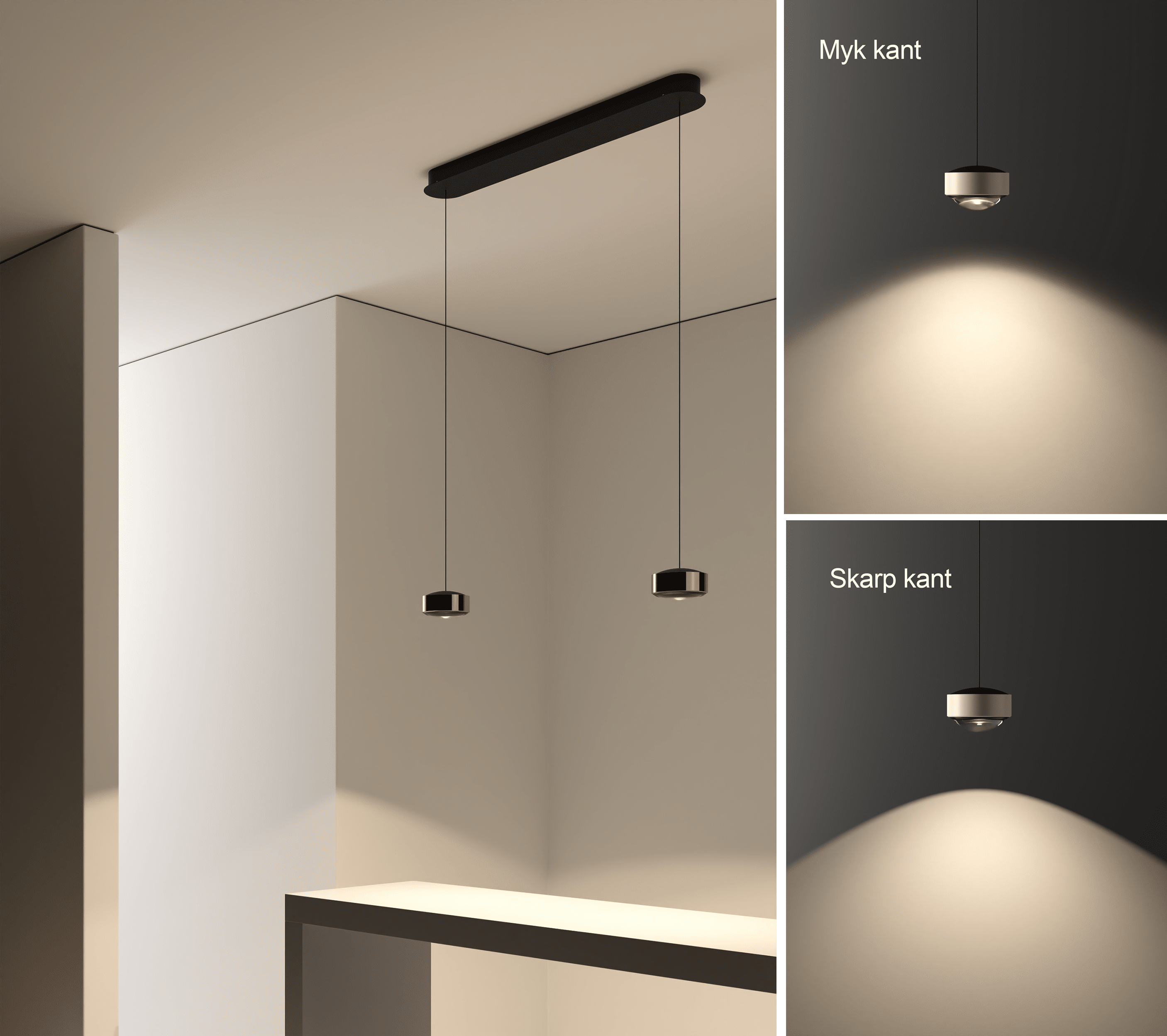 To uavhengig høyderegulerbare lyskilder med et trinsesystem integrert i baldakinen. Produktstrukturen er tilgjengelig i hvit og svart. Dekorring tilgjengelig i hvit, svart, børstet nikkel, brun messing, rosegull og titan. Ekstra klart glasslinse, den ene siden satin-finish, eller helt satin-finish. Tilgjengelig i av/på, Triac eller DALI-dimbar versjon.