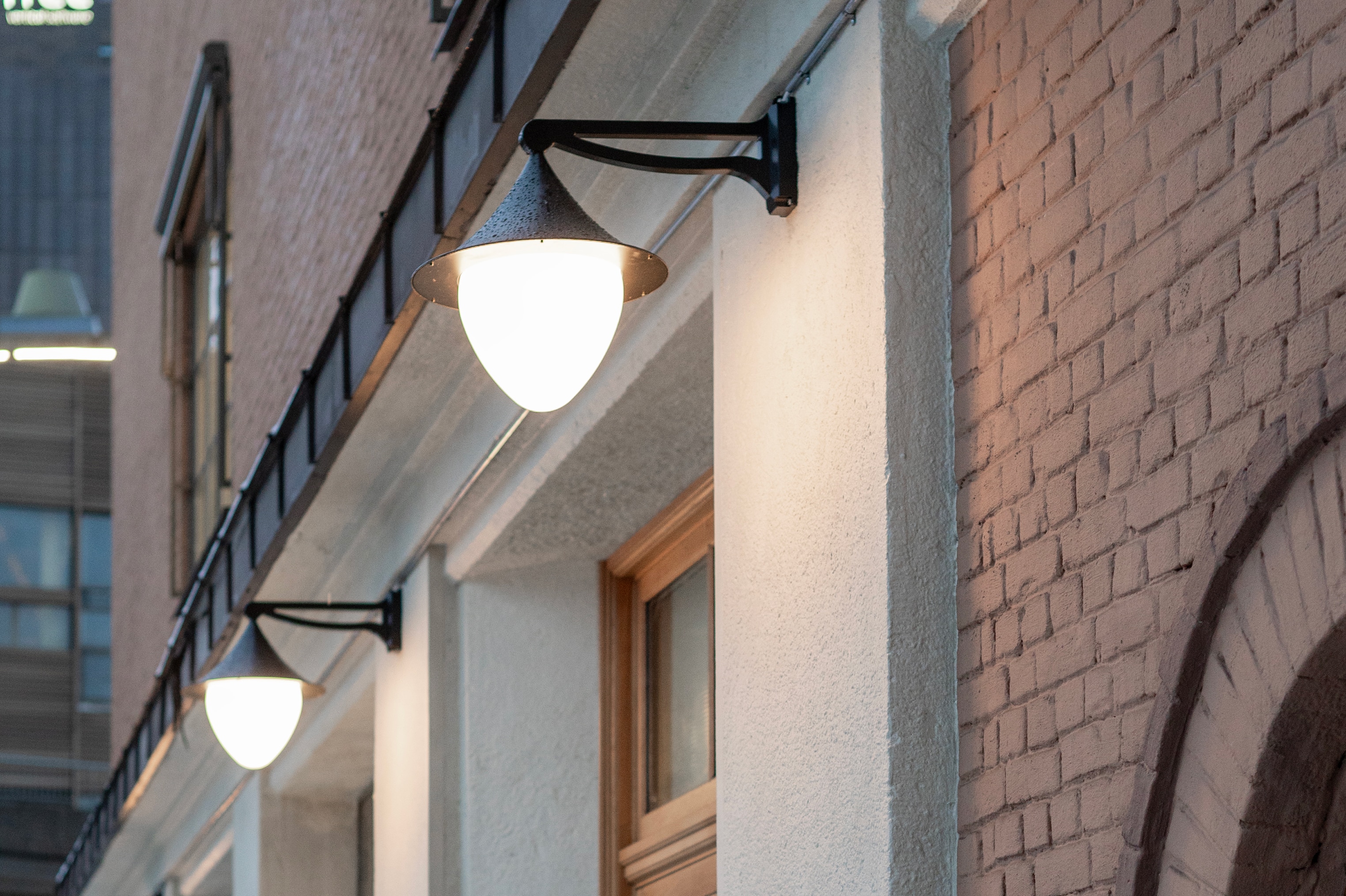 Hasselnøtt vegg er basert på bilder fra 1928, hvor vi har konstruert en visuelt lik lampe med moderne teknologi på innsiden. Bl.a med støtsikkert glass (IK) og tilrettelagt for DALI. Lampen er klassisk nøytral, med rundtstrålende opal underside og avskjerming over horisontallinjen. Arm og housing er av aluminium.