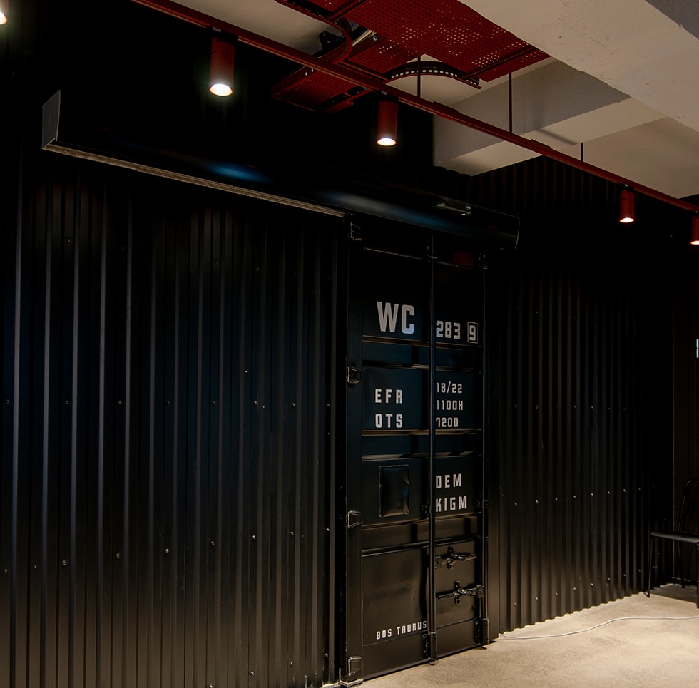 – Dette er et spesielt kult prosjekt, laget av Krohnark. Kantinen henter inspirasjon fra New York’s tidligere industrijungel, bedre kjent som Meatpacking District. Temaet er tatt helt ut til fingerspissene i det store kantineområdet, bl.a ved at belysning og en rekke andre tekniske elementer er levert i spesialfargen «kjøttrød». Sammen med svært gjennomført innredning, gir dette en rå, industriell følelse – samtidig som atmosfæren er lun og hyggelig, forteller Simen.